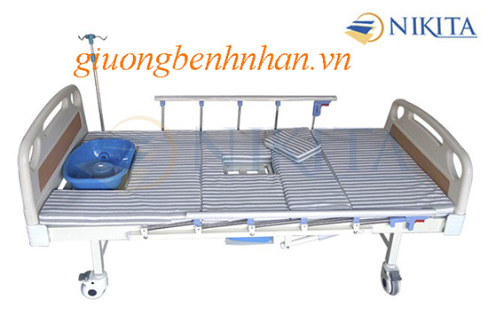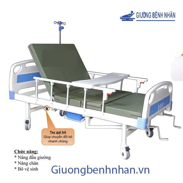 Tay quay 3: Chức năng vệ sinh: giường có tay quay bô vệ sinh hay cong gọi là tay gạt bô vệ sinh giúp người bệnh có thể đi vệ sinh tại giường, cơ cầu đóng mở bô vệ sinh rất dễ dàng. khi chúng ta gạt cần gạt thì tấm đệm chỗ bô vệ sinh sẽ tụt xuống dưới gầm giường đồng thời bô vệ sinh sẽ được đẩy áp sat miệng lỗ để cho người bệnh đi vệ sinh. Sau đó khi bệnh nhân đi vệ sinh xong chúng ta gạt ngược trở lại ban đầu, bô sẽ được trở ra, miếng đệm phần bô được đậy lại.