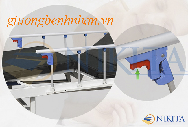 Thành giường chắn, dễ dàng thu gọn hoặc nâng lên: thành giường có nút bấm nâng hạ dễ dàng giúp chống té ngã người bệnh.